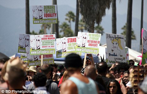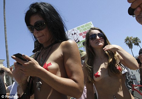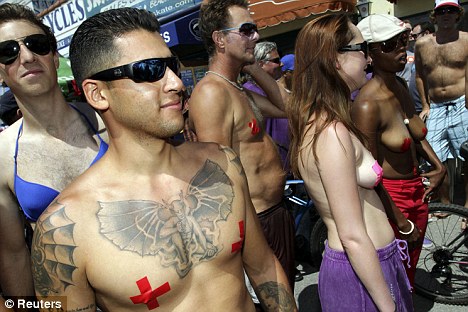 为权利而战:参加昨日加州威尼斯海滩举行的“裸上身”游行的成员,可以选择给自己贴上乳贴。