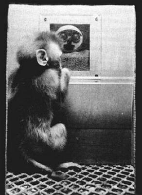 " 第一个(假猴子)母亲是用布做的。它可以喷射高压空气,几乎能撕裂小猴子的皮肤。小猴子什么反应呢?它只是更加紧紧的抓住这假妈妈,因为受惊吓婴儿的本能 就是如此。。。但我们没有放弃。我们做了另一个机械猴子妈妈。它能够猛烈的震动,但小猴子只是抓得更紧。我们做的第三猴子妈妈能够从身体里弹出铁丝网,把 小猴子打飞。小猴子打飞后,爬起来,等待铁丝网收回去,然后又爬上假妈妈。我们最后做了一个‘刺猬’妈妈。它可以浑身弹出尖刺。小猴子被这些尖刺吓坏了, 但是它等到刺收回去后,就回到‘妈妈’身边,紧紧抓牢。“
