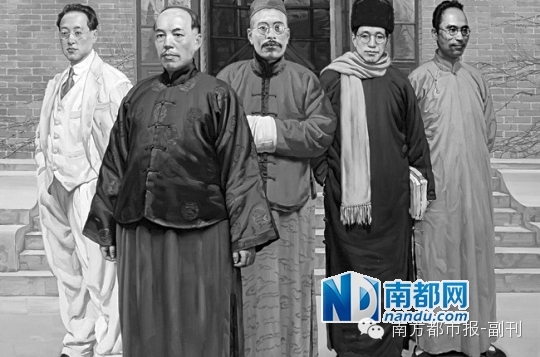 陈丹青油画《国学研究院》,这幅画反映了民国时期知识分子的着装特点:有人穿西装,也有人穿长衫,甚至有人穿长袍马褂。