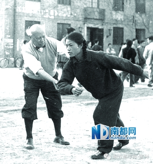 1950年代,清华大学马约翰教授在上体育课,穿的是很典型的西欧式灯笼裤。