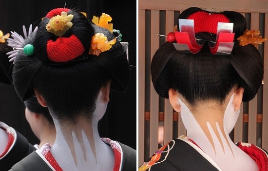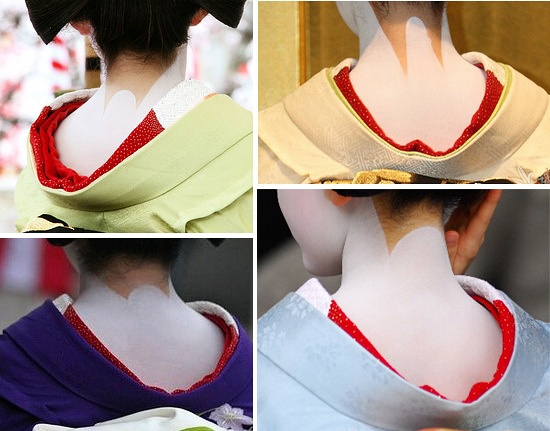 在成为舞妓前两年,领子是全红的,上边刺绣有和风花纹。而从从业第三年起,领子会变成前白后红。