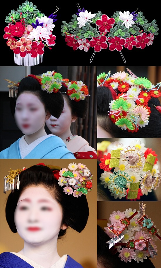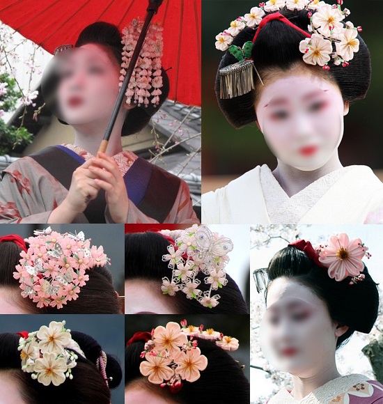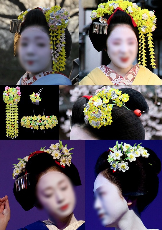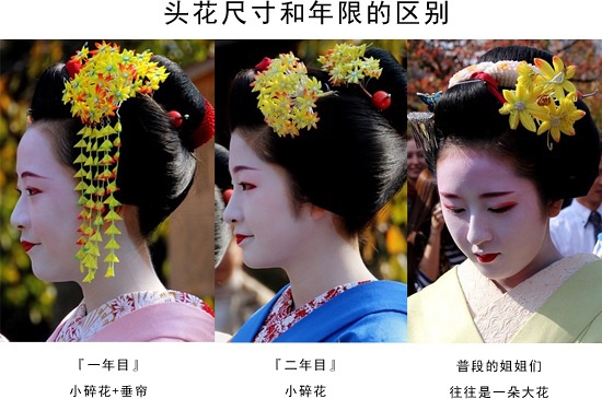 一般一年的舞妓有垂帘,二年的垂帘去掉但依然才用小碎花,三年左右就开始带1-3朵大花