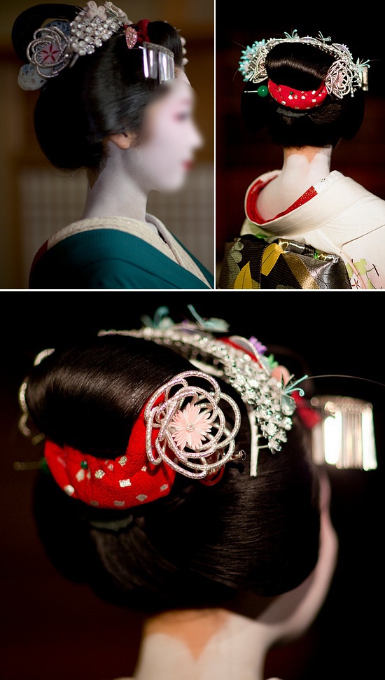 ③「勝山髷」是普段的舞妓在「祇園祭」时的特定发型。一般采用银花装饰在发髻的前方和两侧。