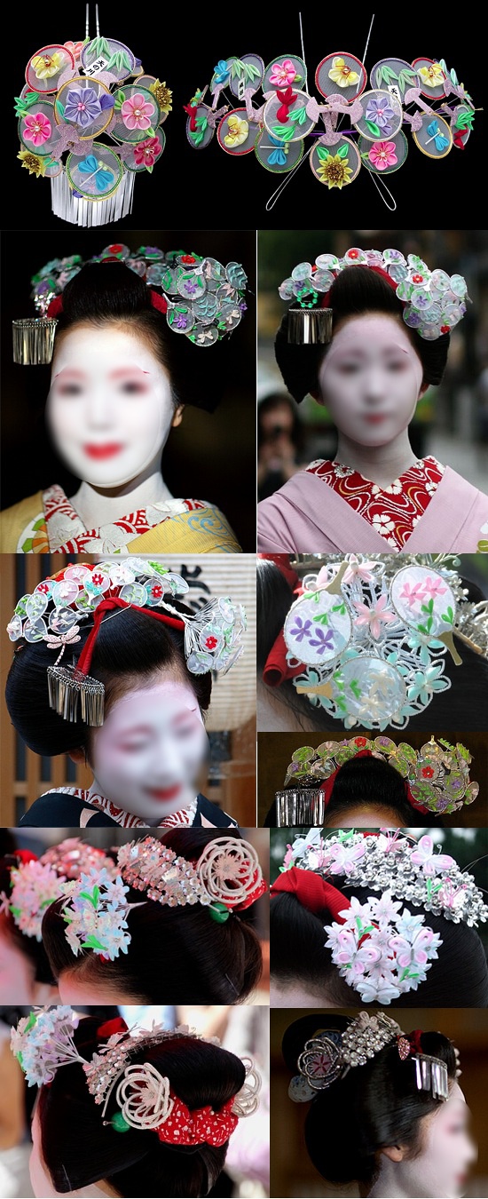 含义 :整个城市的色彩都在忙于为祇園祭做准备,舞妓们也努力的把自己打扮得更活泼可爱一些,团扇、金鱼这些能带给人一丝清凉的京都夏日风物,自然是姑娘们的首选。银色的梵天(ぼんてん),则是配合「勝山髷」,插于发髻两侧。