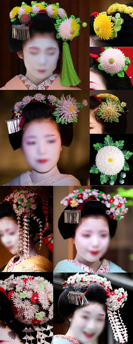 含义:和桔梗一样,年纪稍大的普段舞妓会喜欢插一朵层次多的大菊花在左髻,给人以深刻的印象。年轻舞妓则喜欢带由众多小菊花组成的花冠,颜色多偏清淡,不会像姐姐们那一朵大菊花一样的惊艳。