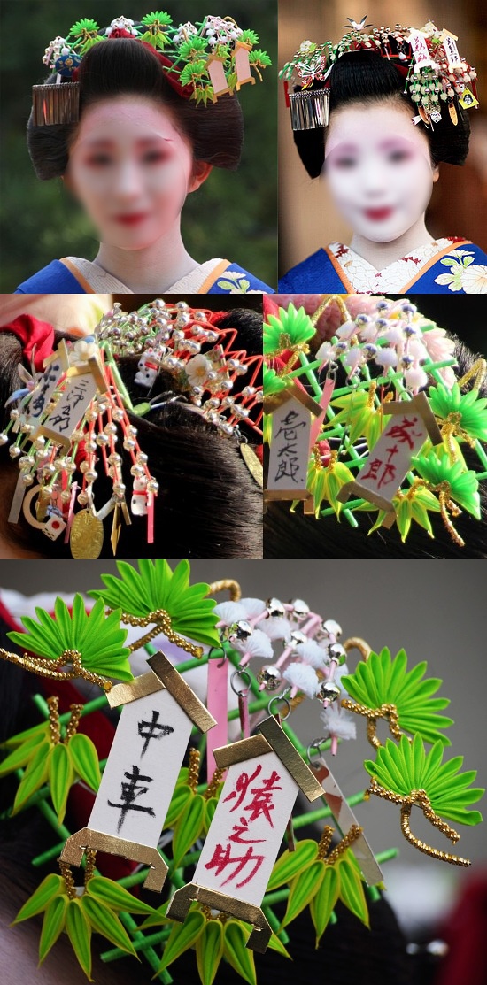这 个发饰源于祇園南座界标----“京都四條南座”劇場的一个传统。每年12月,“京都四條南座”劇場会举行“吉例顔見世興行”,同时剧场外就会挂起用「勧 亭流」字体书写的演员名牌,这一特色被誉为“京都の師走の風物詩(京都十二月的特色)”。一般「顔見世」的持续时间是11月30日到12月26日。每年与 此并行的,在「顔見世」期间,京都五花街(祇園甲部、宮川町、上七軒、先斗町、祇園東)的芸、舞妓会各选一天(5个地方互不交叉),在剧场门口进行「花街 総見」。在「花街総見」时,舞妓们带着一种模仿剧院外看板的发饰,且这种看板一开始是無地(空白)的,舞妓们会在「花街総見」结束后,去乐屋问候时会请自 己喜欢的役者在看板上签名,或者通过和姐姐们的关系要到役者的签名。这既是一种表示对歌舞伎演员的支持,当然也是自我宣传...