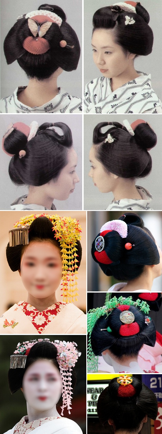 日常款「割れしのぶ」:舞妓初期的发型,一般在正式成为舞妓两年内,工作时一般左侧为布制的、瀑布般的花簪垂帘,右边为银制的垂帘。一般舞妓头两年工作时就算未上妆也都会梳着这种头发,去掉所有装饰就是我们经常看到的圆滚滚形状。