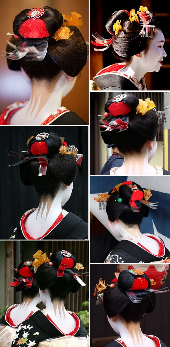 注意:此发型配套的为「三本足」+下唇涂红+黒紋付+金属、龟甲花簪+全红的领子。出现时间很短,但是非常华丽,也是在街上最容易看到的一个造型。