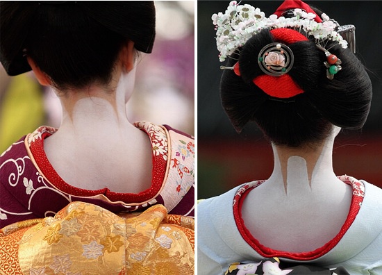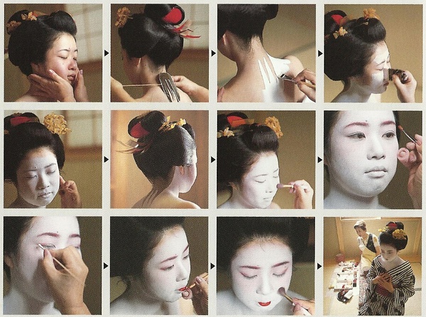 首先了解一下舞妓的化妆过程为先画背部的「二本足」或者「三本足」,然后才开始画脸部,如下图。