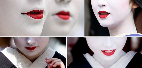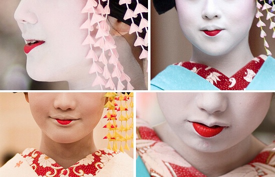 舞妓的口红随着时间的推移,在唇部占得比例会越来越大,一般在成为舞妓第一年,只涂下嘴唇,之后才开始涂上唇,但是上下唇都并不会涂满。