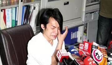 (图注:2009年,台湾艺人大炳再度涉嫌吸毒被抓时,哭着向媒体道歉。大炳真名余炳贤,是台湾的知名谐星,2012年病逝于北京。)