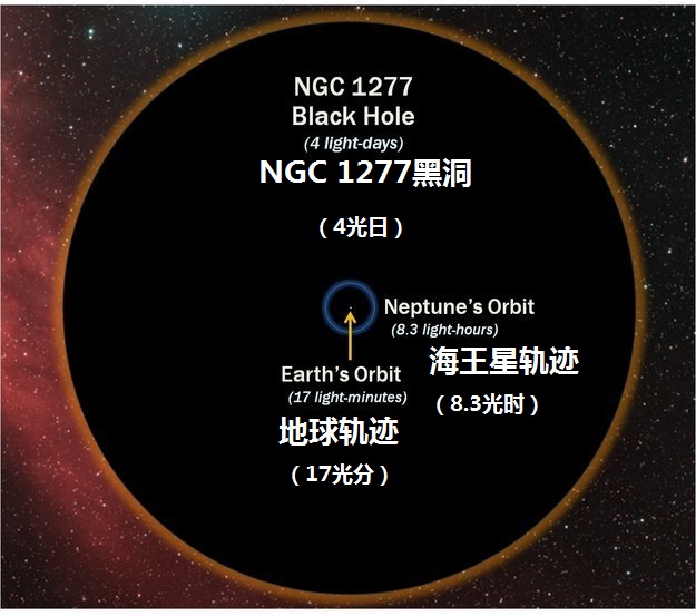 不要忘记宇宙中还有黑洞这个东西的存在,NGC 1277是英仙座的一个星系,其中心有一个质量巨大的黑洞,是太阳质量的130亿倍!!它的大小如下图。。