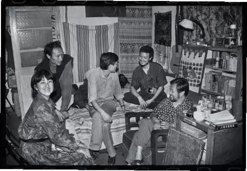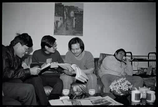 ▲刘晓津、毛旭辉、吕澎、叶永青、栗宪庭在叶帅家中/ 1992 年,昆明