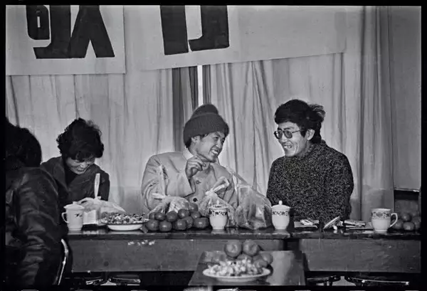 ▲北岛顾城在会上交谈/1986年12月,成都