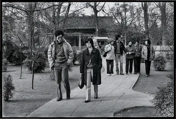 ▲1986年星星诗歌节期间,诗人们在公园漫步/1986年12月,成都,望江公园