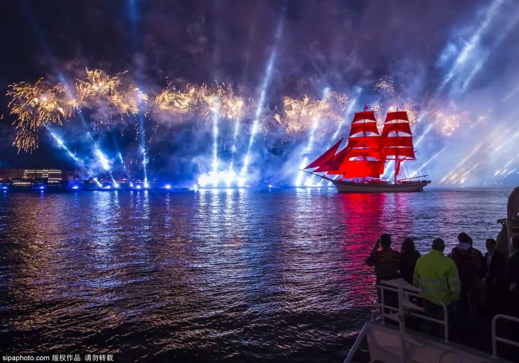 当地时间2015年6月21日,俄罗斯圣彼得堡,圣彼得堡中学毕业生们迎来了一年一度的“红帆节”。当天恰逢夏至日,圣彼得堡涅瓦河上举行盛大的庆祝仪式。