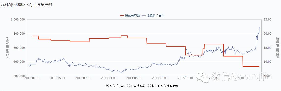 顺便提及一下,宝能在收集万科筹码的过程中,伴随着股东户数的急剧下降。今年年中时,股东户数是65万户,而到三季度股价还没大幅度飙升时,变成了33万户。最近那显然要更小了。早做功课,可以赚这笔宝能抬轿子的钱啊。