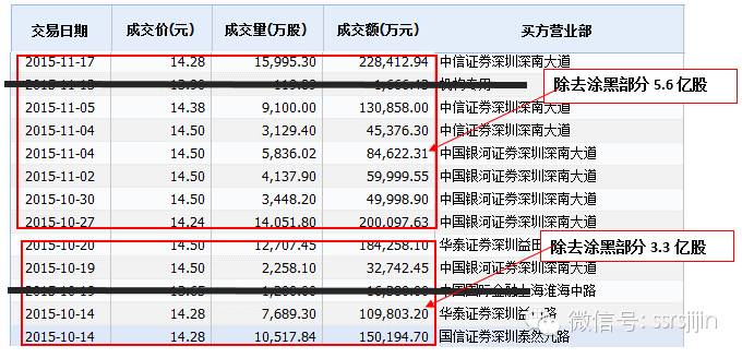 第二阶段, 2015年10-11月,钜盛华分两批交易,于2015年10月14日-20日大宗买回通过互换权益持有的万科约3.3亿股;10月27日-11月17日大宗买回通过收益互换持有的万科约5.6亿股。这两批次大宗交易占据了10月-11月万科A大宗交易的绝大部分: