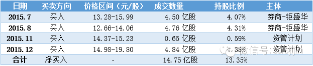 第一阶段,2015年7-8月,钜盛华通过互换(两批)和两融买入,完成时,持股8.34%,持股结构如下。