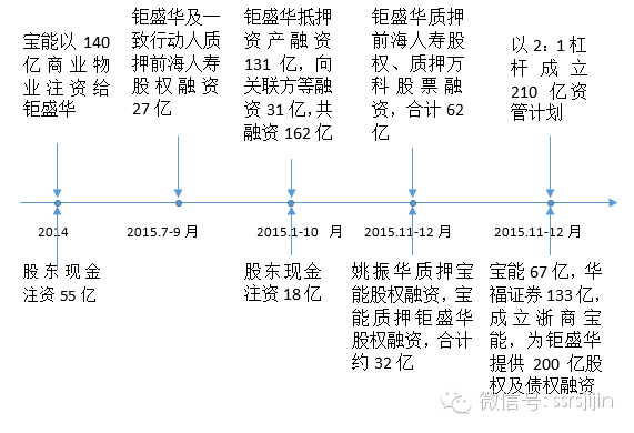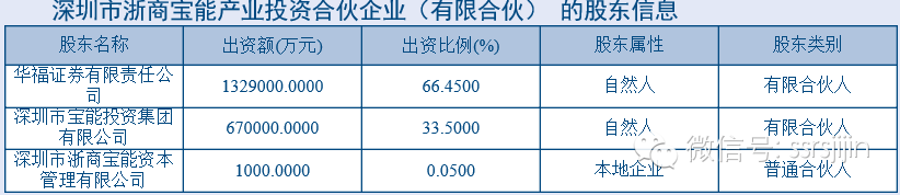 10月31日之后一共融出了94亿元,但是还没完,他准备在杠杆之上再加杠杆,怎么加杠杆呢?他选择了2015年11月11日成立深圳市浙商宝能产业投资合伙企业(有限合伙),该公司出资额是200亿,宝能集团出资67亿(94亿资金还剩27亿元),华福证券出资133亿(这笔钱不一定是华福证券自有资金)。2015年11-12月,浙商宝能可能通过股权和债权的方式将这200亿资金注入到钜盛华。