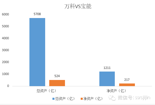 之所以说小宝能、大万科,是相对而言的,因为万科是一个庞然大物。以宝能的总资产规模,如果它是上市公司的话,2800家上市公司,能排在160名附近,一点也不小,相当于国海证券的规模。而万科在A股里资产规模是30名。它们的总资产规模和净资产规模比较是这样的。