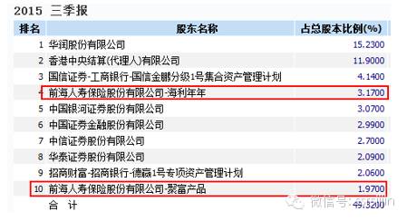 故考察万科三季报股东明细,即可大致看到前海人寿持有万科的最终状态(如下图)。前海是通过旗下保险产品买入的,进入前十大股东的两只产品合计持股6.14%,也就是说前海的持股主体都在这里了。